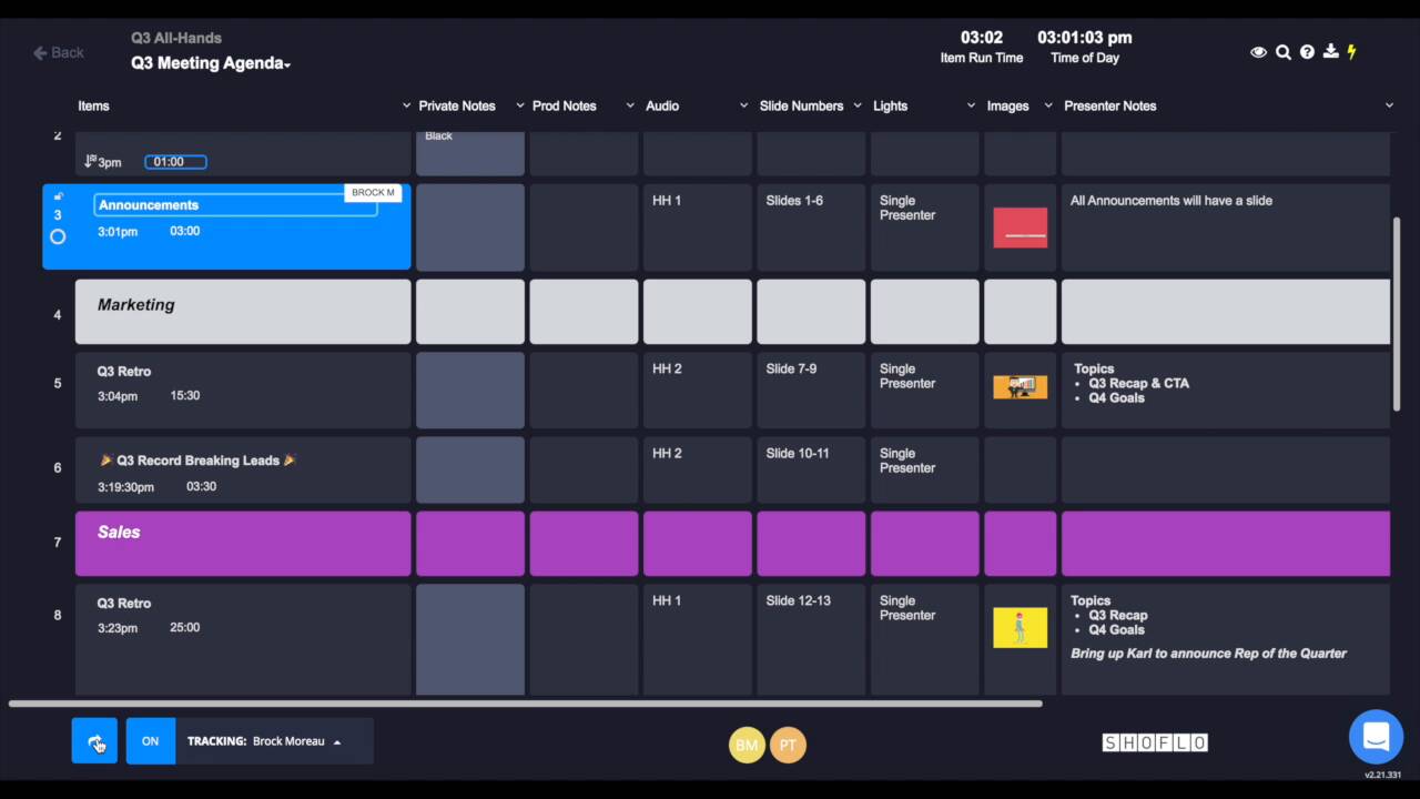 Mehrere Teammitglieder können zeitgleich am Ablaufplan (Run of Show) arbeiten. Änderungen an Tagesordnungspunkten, Zeiten oder Notizen werden in Echtzeit für alle sichtbar aktualisiert. Niemand arbeitet mehr versehentlich mit veralteten Stand des Plans.